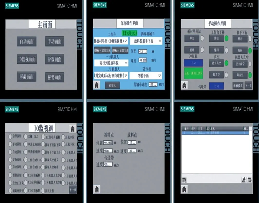 根据冲压生产线的运动控制需求和工作流程,编写PLC 程序,其中HMI 人机交互界面包括自动操作界面、手动操作界面、I/O 监视界面、参数设置界面、屏蔽界面、故障报警界面(图6)。
