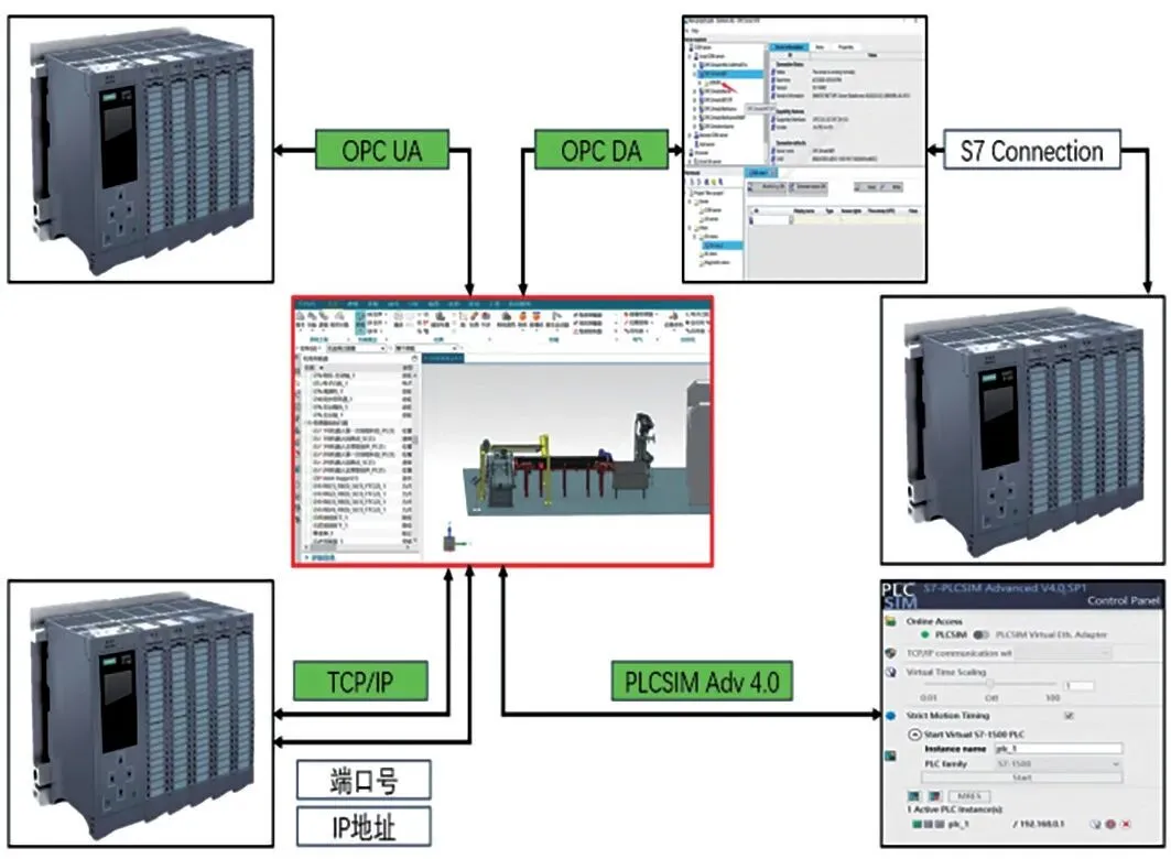 常见的软件在环虚拟调试通信类型有OPC DA、OPC UA、TCP/IP、PLCSIM Adv。通过基于四种传输协议的虚拟仿真试验,对比分析软件在环虚拟调试仿真的试验结果,最后选择稳定性好、效率高的虚拟仿真传输协议。软件在环虚拟调试试验的模型见图7。