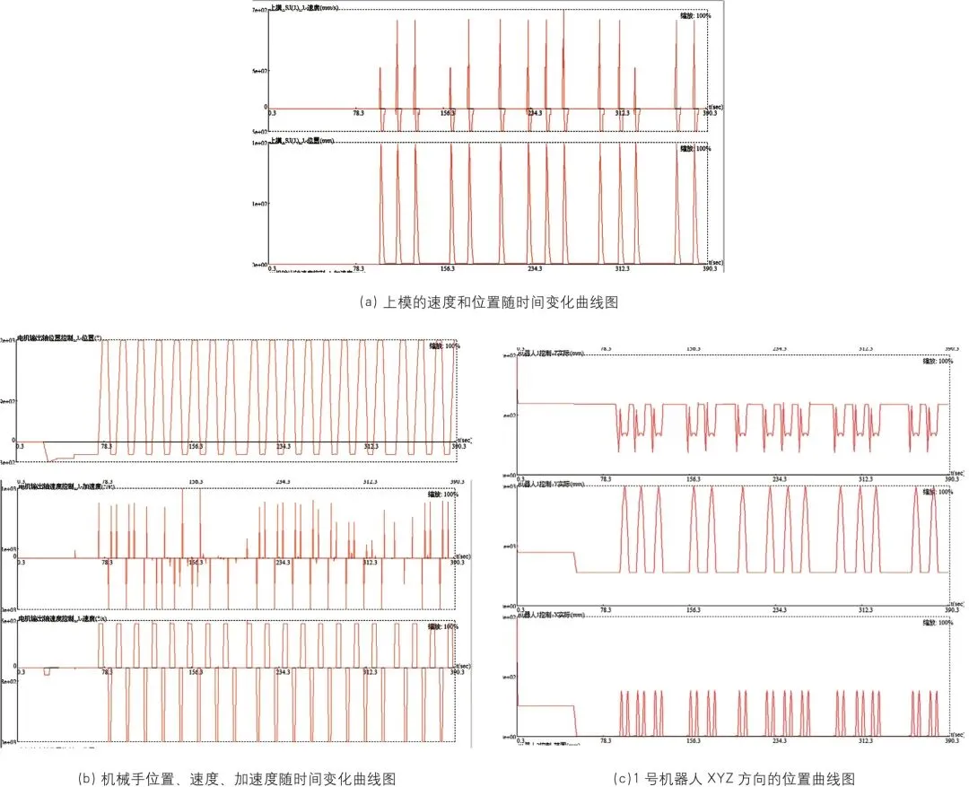 通过查看伺服电机输出轴的加速度、速度变化曲线可以发现,机械手完成初始化后,机械手取料放料运行平稳,取料和放料时能够送达传送带。通过观察上模运动曲线和机器人的XYZ 方向位移曲线的变化,可以发现压力机与机器人上下料之间没有发生干涉,符合实际要求,验证了上下料轨迹的可行性。