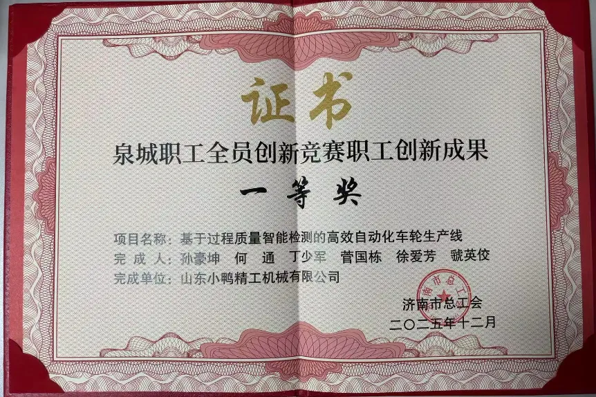 在济南市总工会举办的“创新赋能 建功泉城”2025年度泉城职工全员创新成果分享会上,小鸭精工机械公司自主研发的“基于过程质量智能检测的高效自动化车轮生产线”项目,荣获职工创新成果一等奖。