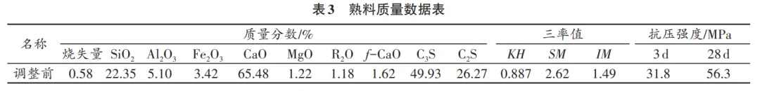 根据理论分析并结合实际情况,调整配料方案,将熟料三率值由原来的 KH=0.88±0.02,SM=2.60±0.1,IM=1.40±0.1 调整为 KH=0.910±0.02,SM=2.40±0.1,IM=1.60±0.1。调整后的熟料化学分析见表5。