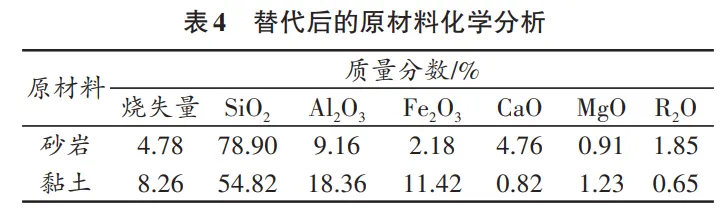 熟料中碱含量偏高会使水泥发生快凝、结块及需水量的增加;碱含量高会影响熟料质量,首先碱与硫结合生成 R2SO4固溶体,增加液相黏度,影响液相反应,使 CaO被充分吸收形成 C3S的过程困难,熟料强度下降;碱会使构筑物表面起霜反碱,影响美观,终端用户反馈较多,严重影响销售量和公司的产品品牌。对此,组织召开专题会,找出碱含量高的关键因素,经分析对比熟料中碱含量偏高的原因是由于生料配料中用原料砂岩和含铁页岩中的碱含量偏高导致,因此碱含量越高,熟料后期强度越低,特别是随熟料 KH 的提高而降低,因此为提高熟料质量,最有效措施就是降低原材料中的碱含量,经专题会讨论决定,采用低碱粘土替代含铁页岩,并根据配料化学成分增加铁质校正材料,同步寻找周边低碱砂岩进行替代使用,降低熟料中的碱含量,见表4。