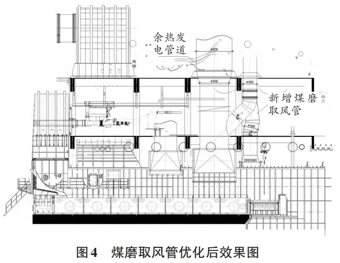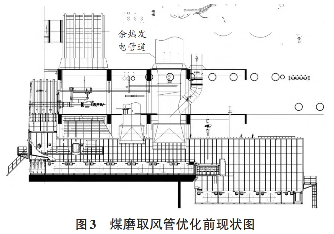 根据生产运行情况,因我公司预热器是双系列低阻六级旋风预热器,C1 出口温度本身较低,窑尾SP 炉烟气温度较低基本不发电,加之在煤磨开机时,由于煤磨热风抢风致使入窑头AQC锅炉的温度和压力降的较快,特别是中温段取风口,低的时候温度降到 350 ℃,导致发电量严重下滑,针对此情况,对原煤磨热风管从中温取风管上取热风改到直接从篦冷机本体进行取风,新制作安装一个2500 mm×2500 mm,直径Φ1 600 mm的煤磨热风取风管,减少或杜绝煤磨开机抢风,提高发电量。