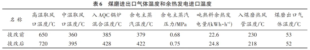 煤磨热风管技改后,二次风和三次风温度有了较大的改善,在确保煤耗不增加的前提下吨熟料余热发电量在原基础上提高了2 kWh,为企业降本增效优化奠定了坚实的基础,见表6。