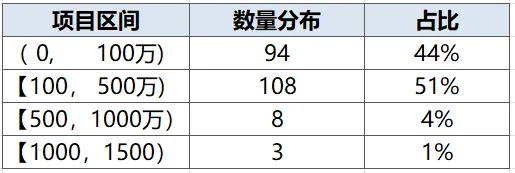 从金额区间来看:招标项目金额“0 - 100 万” 区间占比约为 44% ,“101 - 500 万” 区间占比约为 51%,"500- 1000万"以上金额项目8个,千万级项目3个