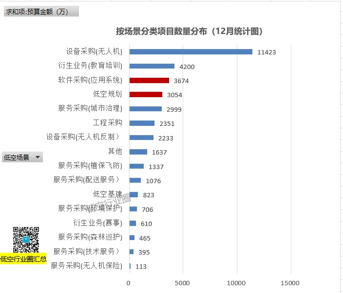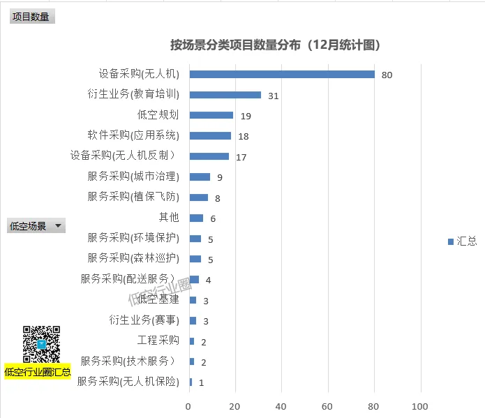 1. 项目数量维度:从项目数量的排序结果来看,依次为:设备采购(无人机含机场80_传统采购) ,教育培训31 、低空规划19(受年底季节性波动较小,需求趋势保持常态化)、设备采购(无人机反制)17、植保飞防9(开始进入启动期)等。