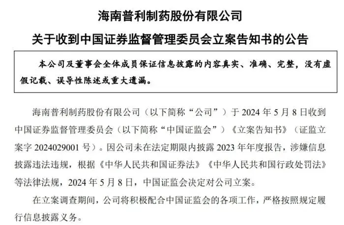 此前,海南证监局向普利制药发出行政监管措施决定书,经现场检查发现该企业2021年、2022年年度报告中的营业收入、利润等财务信息披露不准确,海南证监局要求普利制药对相关年度营业收入、利润等财务信息的真实性、准确性进行自查。对此,普利制药称,自查整改工作仍需要时间,预计无法按时完成2023年年报编制工作。