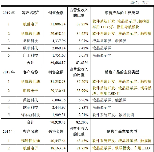 不仅在采购端依赖单一供应商,在销售端,华安鑫创的客户构成也高度集中,主要客户只有两个:航盛电子和延锋伟世通,2017-2019年,来自两个主要客户的收入占比合计分别为70.2%、70.19%和71.87%。