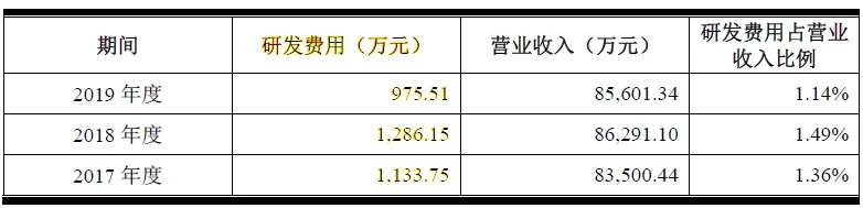 另外一个重大发现,2017-2019年华安鑫创研发费用分别为1,133.75万元、1,286.15万元和975.51万元:
