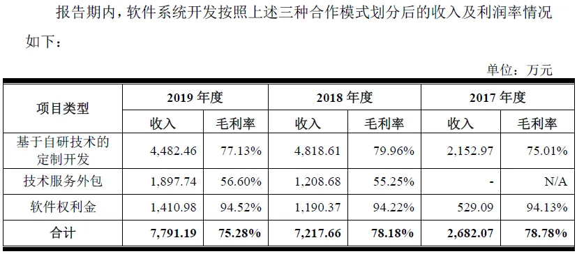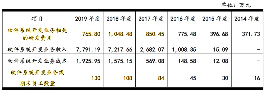 这意味着,除软件系统开发业务以外的研发费用分别只有283.3万元、237.67万元和209.71万元,就算假设剩余部分都是定制业务的研发费用,相对于61,232.20万元、40,784.75万元和39,907.70万元的定制业务销售收入而言,也仅是杯水车薪。