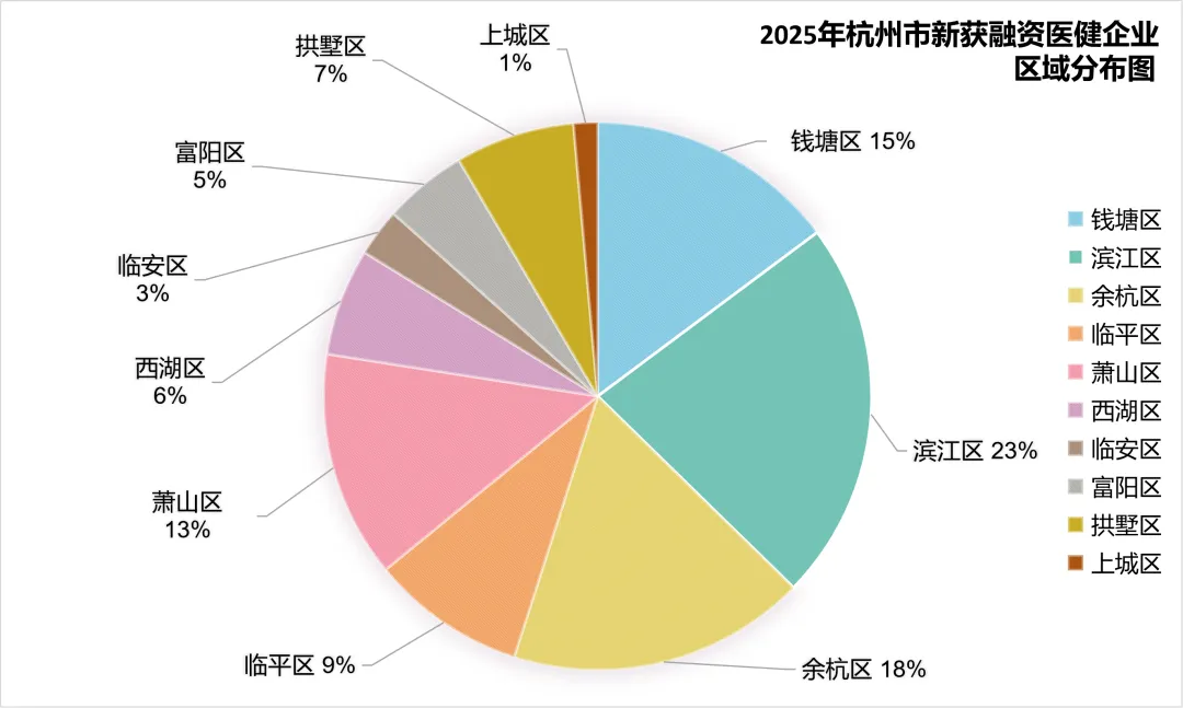 杭州市发展生物医药产业的“一核四园多点”布局已有了明显的集聚效应,2025年新获融资企业中“一核四园”区域占比高达78%,与2024年持平,呈现出”规划高水平指引及政策精准护航”下杭州生命健康产业的高质量集聚发展。相较2024年,余杭区、萧山区、拱墅区2025年占比均增长3%。