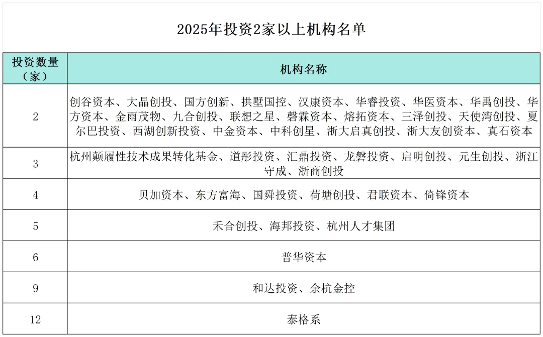 在2025年杭州被投资的142家生命健康企业中,共得到353家资本和企业的投资。其中持续投资2家次的机构有23家,投资3家次的机构有8家,投资4家次的机构有6家,投资5家次的机构有3家,投资6家次的机构1家,投资9家次的机构有2家,投资12家次的机构1家。