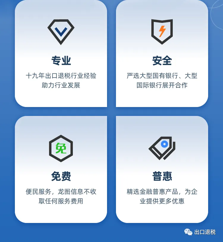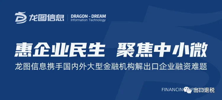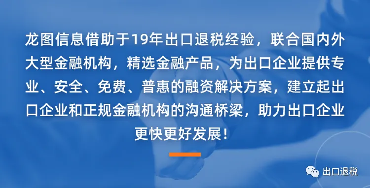 现在是个出口贸易旺盛的时期,是一个出口企业发展的大好机会,龙图信息作为拥有19年出口退税经验的龙头企业,联合国内外大型金融机构,精选金融产品,为出口企业提供专业、安全、免费、普惠的融资解决方案,建立起出口企业与正规金融机构的沟通桥梁,助力出口企业更好更快的发展!