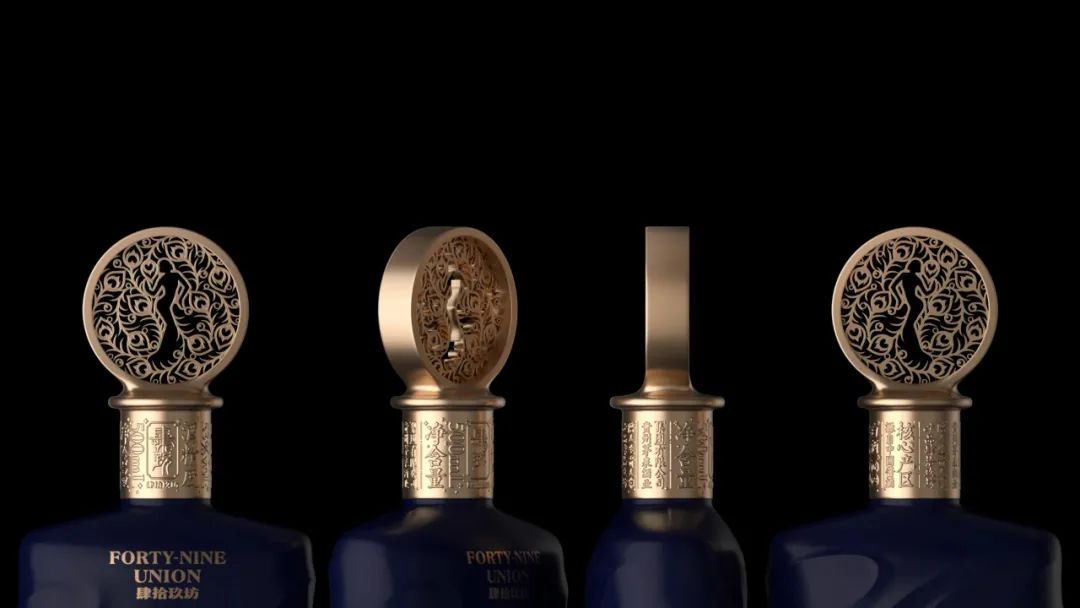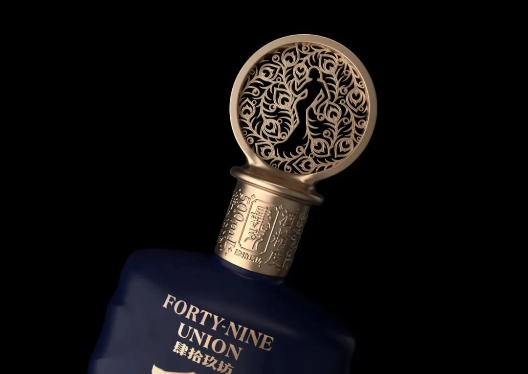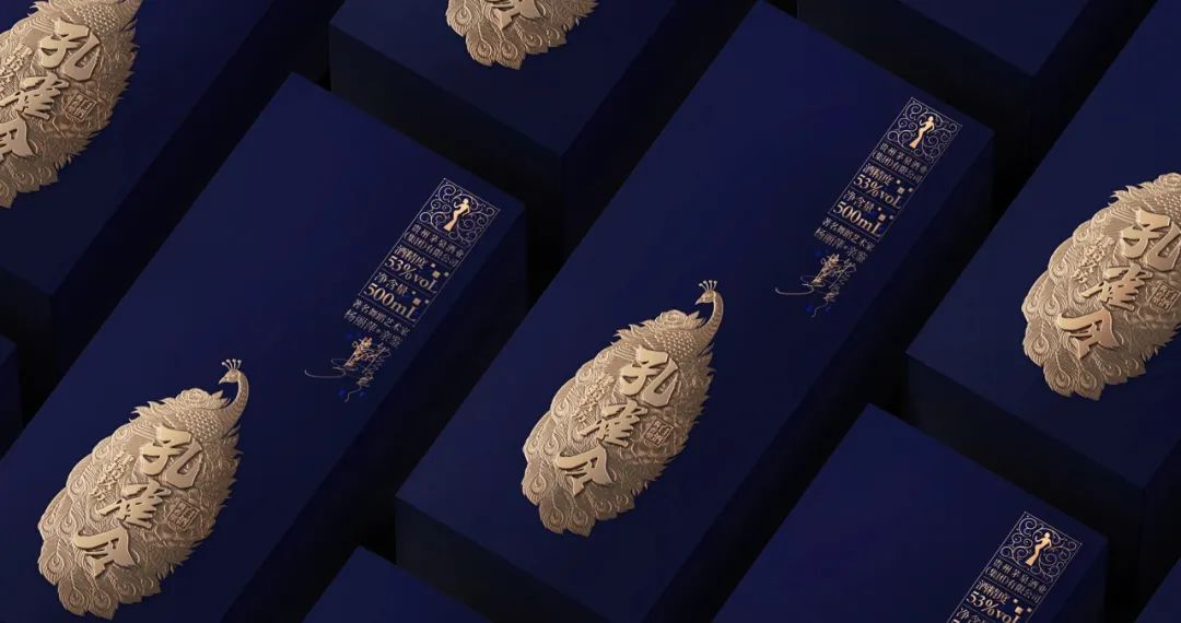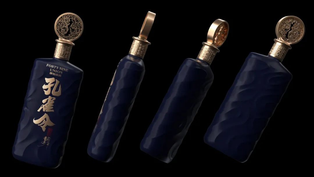 酒瓶体的丰富而不规则的纹理,一方面代表着舞蹈过程中的优雅裙摆,另一方面也是对白酒丰富体感的一种诠释。以深蓝色为主色调,也让产品由内而外散发出一种神秘的气息。在瓶盖的形状上,你还可以清楚地看到由孔雀羽毛组成的舞者的舞蹈姿势。盒外孔雀与山茶花(云南花卉)的组合,使产品更加独特。