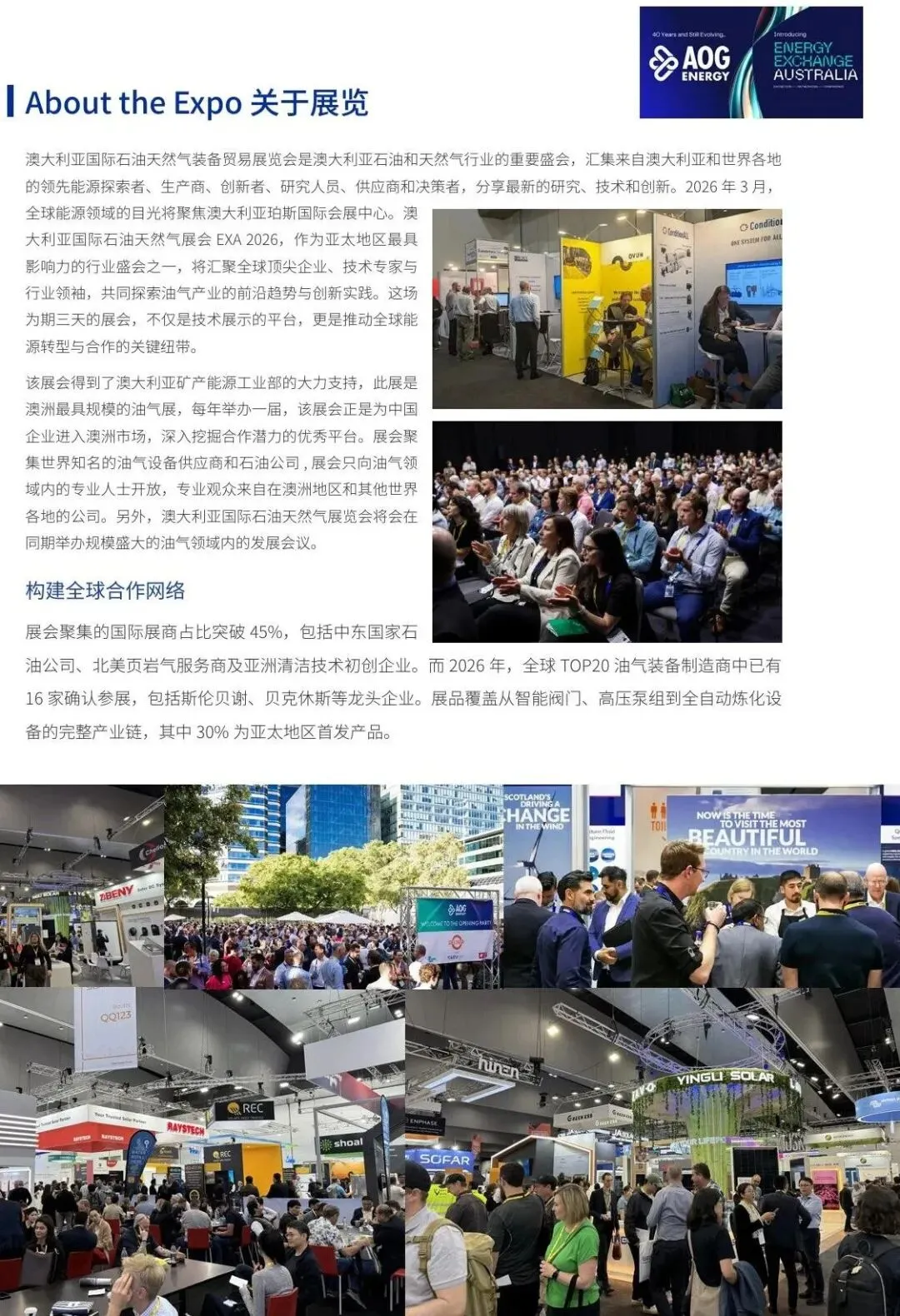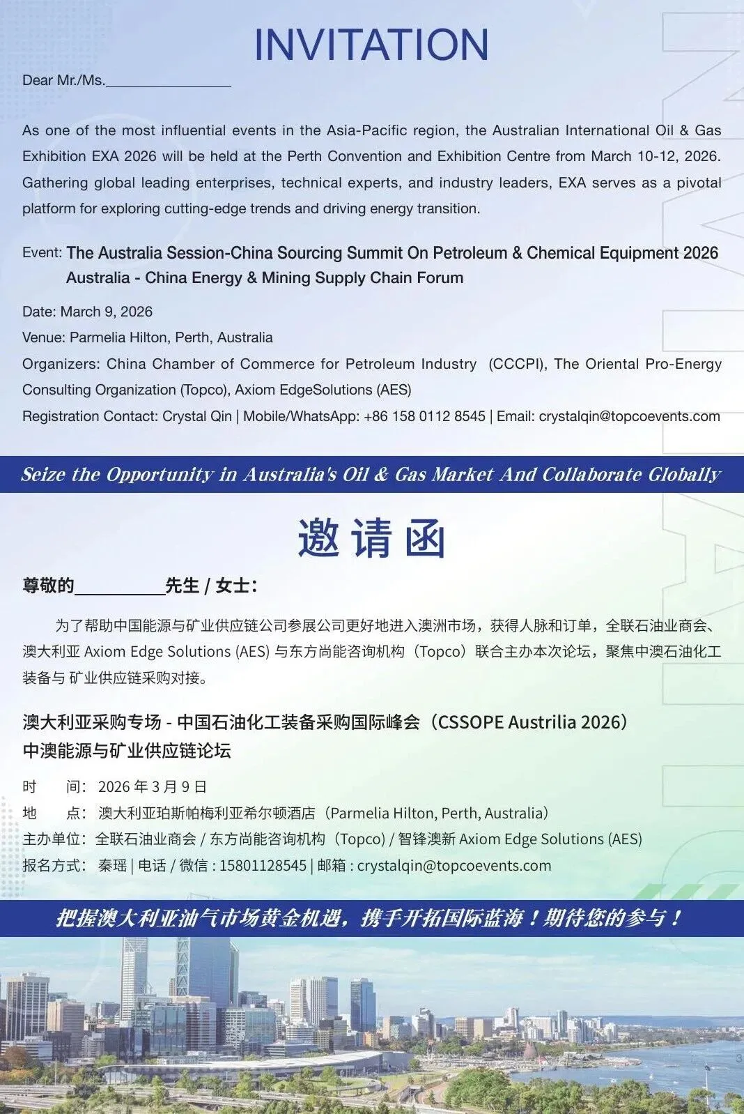 2026 年 3 月 10 日 - 12 日,由全联石油业商会、东方尚能咨询机构、澳大利亚AES 智锋澳新公司主办的 “CSSOPE 澳大利亚采购专场 / 中澳能源与矿业供应链论坛”在澳大利亚珀斯国际会展中心举办。论坛将与2026 年澳大利亚石油天然气展览会(EXA) 同期联动,为中国能源企业布局亚太市场搭建高价值对接平台。