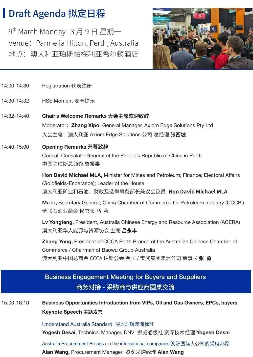 在展会启幕前夕(3 月 9 日),论坛将率先在珀斯帕梅利亚希尔顿酒店启幕。此次活动聚焦中澳能源与矿业供应链合作,可助力企业直接对接海外买家与高层决策者、强化品牌国际影响力,并链接行业权威资源 ——Woodside Energy、BHP、雪佛龙、中石化、中石油等中外头部能源企业均将重磅参与,澳大利亚能源部、中国驻澳大利亚总领馆也将提供官方支持。