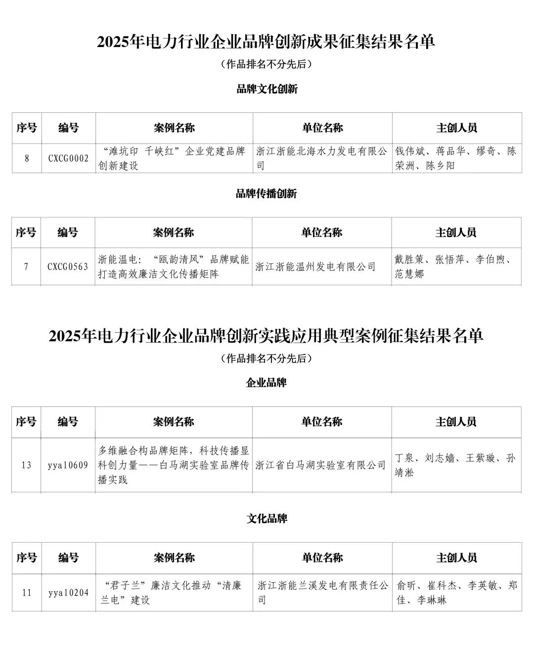 为深入贯彻《质量强国建设纲要》,加快构建新型电力系统背景下的品牌创新生态体系,切实推进电力行业品牌建设,发挥品牌引领示范作用,选树一批电力品牌创新典型,中电联电力品牌集群办公室在行业内开展了2025年电力行业企业品牌创新成果及实践应用典型案例征集活动,得到了广大成员单位及有关单位的大力支持和积极参与。经专家组严格遴选,本次活动精选出了90项创新成果及79个典型案例。浙能北海水电《“滩坑印 千峡红”企业党建品牌创新建设》、浙能温电《“瓯韵清风”品牌赋能打造高效廉洁文化传播矩阵》获评2025年电力行业企业品牌创新成果,白马湖实验室《多维融合构品牌矩阵,科技传播显科创力量一一白马湖实验室品牌传播实践》、浙能兰溪发电《“君子兰”廉洁文化推动“清廉兰电”建设》获评品牌创新实践应用典型案例。