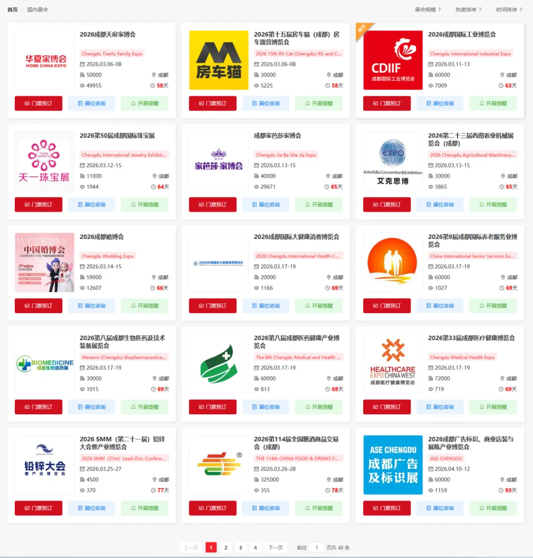 2026年成都世纪城会展中心有哪些展会将会开展?家博会、珠宝展、医疗展、糖酒会、照明展、包装展、美博会、跨境展、农博会、餐饮展、礼品展......本文小编将会为您汇总2026成都世纪城会展中心展会排期时间表,门票领取放在下方,限时预约逛展哦~