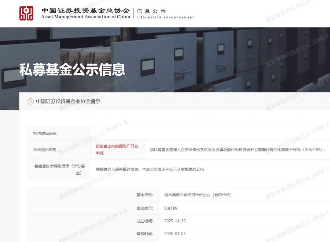 1月5日,榆林鼎创兴榆投资合伙企业(有限合伙) 在中国证券投资基金业协会成功完成备案(基金编号:SBLT89)。该基金首期规模1亿元,由协会会员单位延安市鼎源私募基金管理有限公司担任基金管理人,上海、海南及陕西等地投资人共同出资组建。该基金将重点围绕延安与榆林两地主导产业开展投资,为延榆一体化发展注入强劲基金动力。