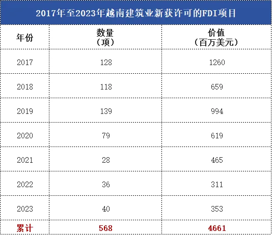 公开资料显示,2017-2023年,越南累计落地568个建筑类FDI(外国直接投资)项目,吸金4661百万美元。平均每个项目砸下8200万美元。