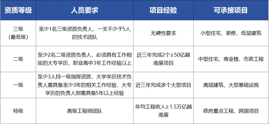 越南新注册企业不可以直接申请一级建筑资质,需要先申请三级建筑资质,然后一级一级往上升级,不可跳级。