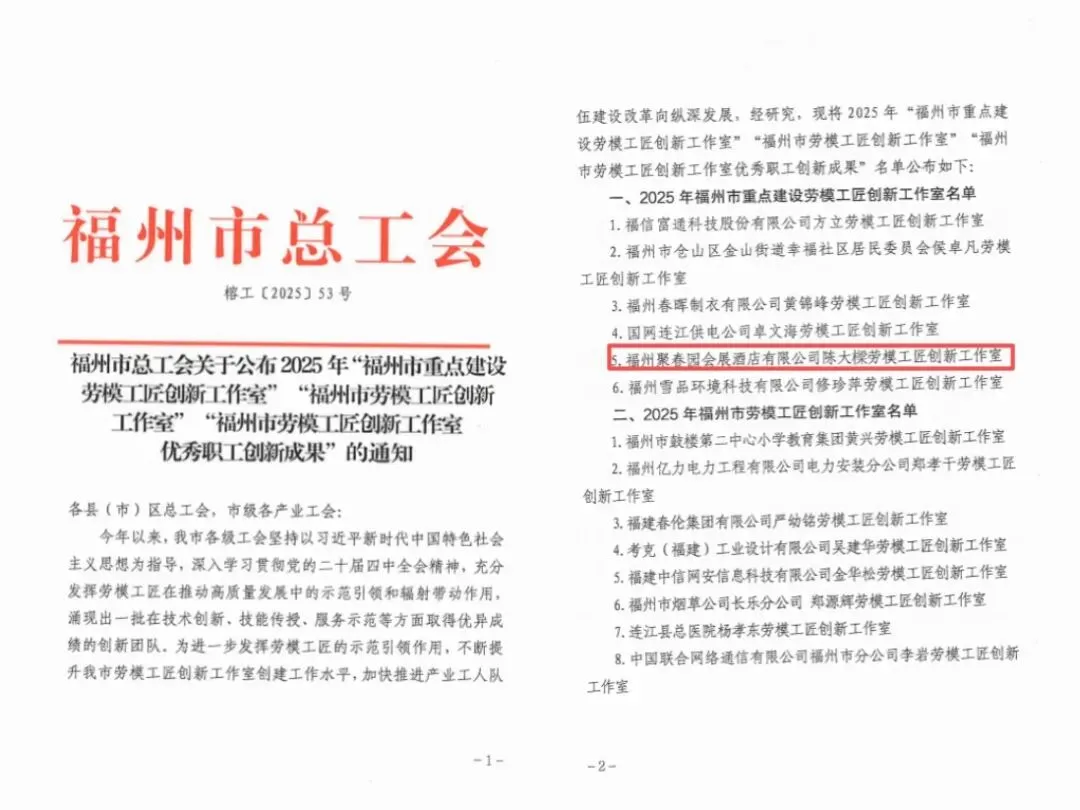 近日,福州市总工会关于公布2025年“福州市重点建设劳模工匠创新工作室”“福州市劳模工匠创新工作室”“福州市劳模工匠创新工作室优秀职工创新成果”的名单,福州聚春园会展酒店有限公司陈大樑入选2025年福州市重点建设劳模工匠创新工作室!