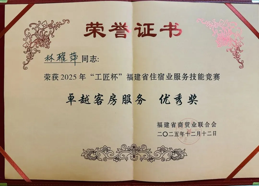 12月12日,由福建省商贸业联合会主办的《2025年"工匠杯"福建省住宿业服务技能竞赛》成功举办。福州聚春园会展酒店选派客房部、前厅部各一名员工参赛,前厅部选手凭借扎实专业技能与稳健临场发挥斩获第三名,客房部选手表现优异,荣获优秀奖。酒店将以此为契机,持续强化员工技能培训,推动整体服务水平再上新台阶。