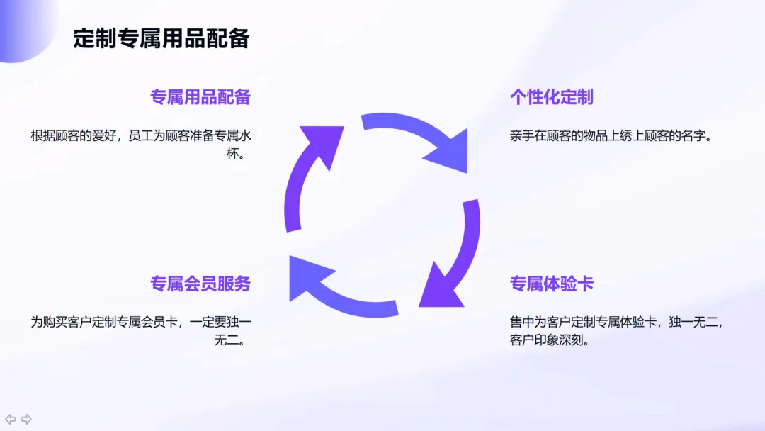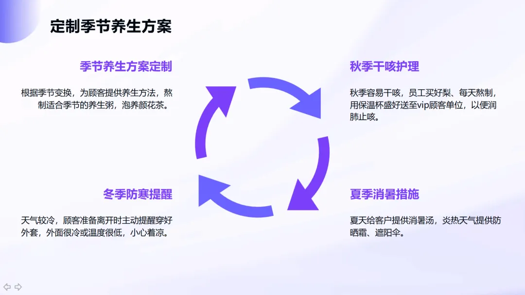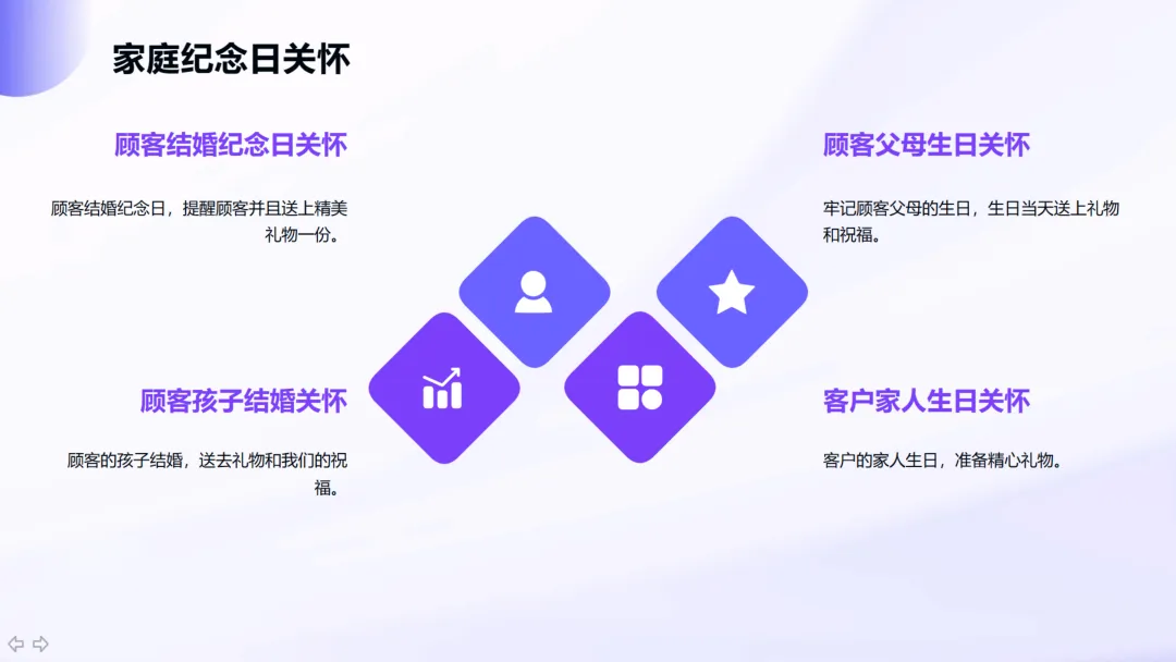 售后长效维度:定期回访顾客、发送天气关怀短信、为客户制定旅游攻略,甚至邀请客户参加公司活动,形成持续的关系维护机制。