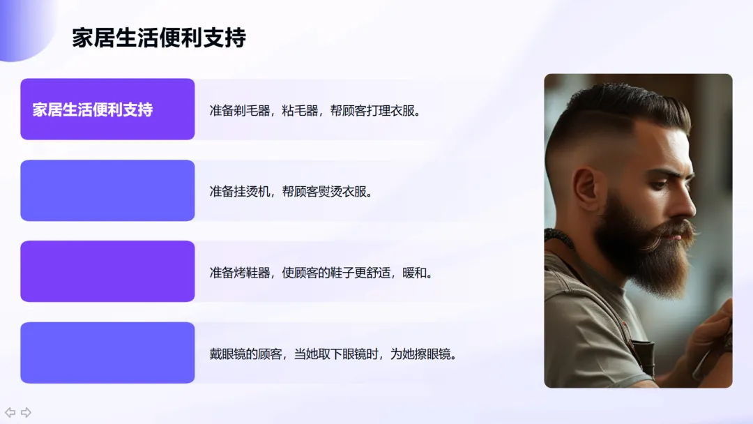 其次,通过系统培训将服务标准化、情感化。例如提供擦鞋服务、帮顾客熨烫衣服等,需确保每位员工都能以专业且温暖的方式执行。