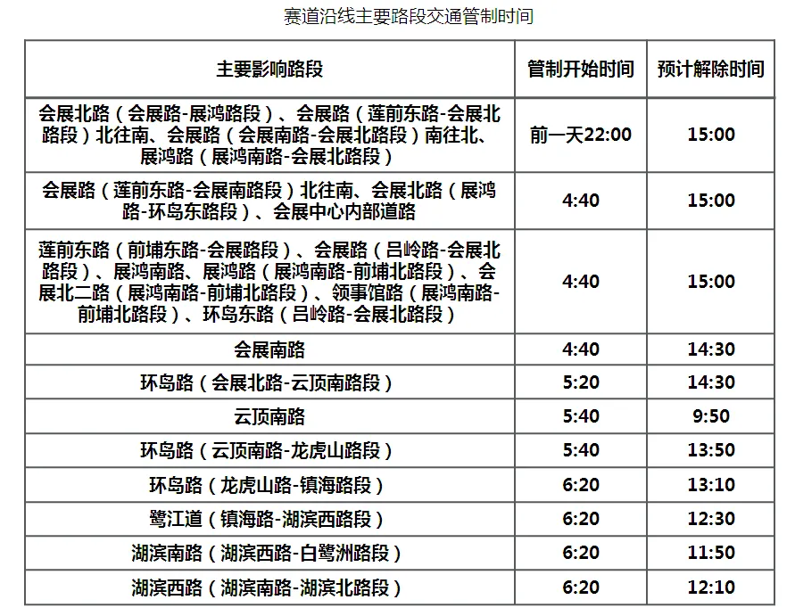 4时40分起,思明区莲前东路前埔东路口至会展路口段、会展路吕岭路口至会展北路口段、展鸿南路、展鸿路前埔北路口至展鸿南路口段、会展北二路前埔北路口至展鸿南路口段、领事馆路前埔北路口至展鸿南路口段、环岛东路吕岭路口至会展北路口段禁止车辆驶入,放置《车辆通行证》的车辆、执勤任务的特种车辆和公交车除外。限制通行范围内小区居民和酒店住客的车辆允许驶出。