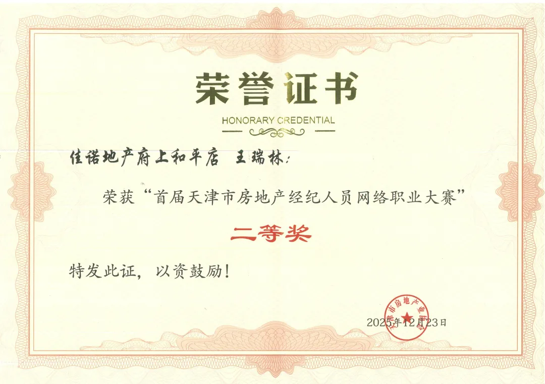企业与个人的双重荣誉加身,不仅是天津市房地产业协会对佳诺诚信经营理念与高品质服务水平的权威认可,更充分印证了全体员工的专业素养与综合业务能力。长期以来,佳诺始终以 “专业驱动发展” 为核心导向,通过构建全周期专业培训体系、开展常态化技能竞技活动,不断提升团队核心竞争力,专注为客户提供更安心、高效的房产交易全流程服务,凭借稳定优质的服务体验赢得了数万家庭的信赖与青睐。