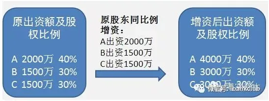 【微案例】上述案例中,若甲公司董事会提出、股东会决议通过:各股东按原投资比例共增加出资5000万元,则增资前后出资额及股权比例如下: