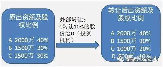 【微案例】上述案例中,若甲公司董事会提出、股东会决议通过:C(投资机构)将所持30%股份中的10%转让给新股东D(投资机构),则转让前后出资额及股权比例如下: