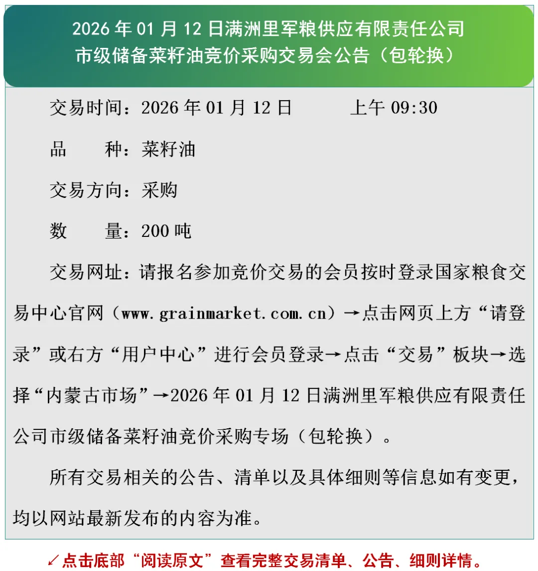 2026年01月12日满洲里军粮供应有限责任公司市级储备菜籽油竞价采购交易会公告(包轮换)