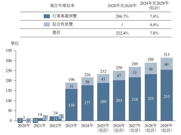 根据弗若斯特沙利文(Frost & Sullivan)报告,预计境外展览总数将从2024年的216场增至2029年的315场,预计行业专题展览数量将由2024年的177场增至2029年的255场,同期由39场增至60场。
