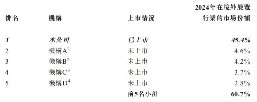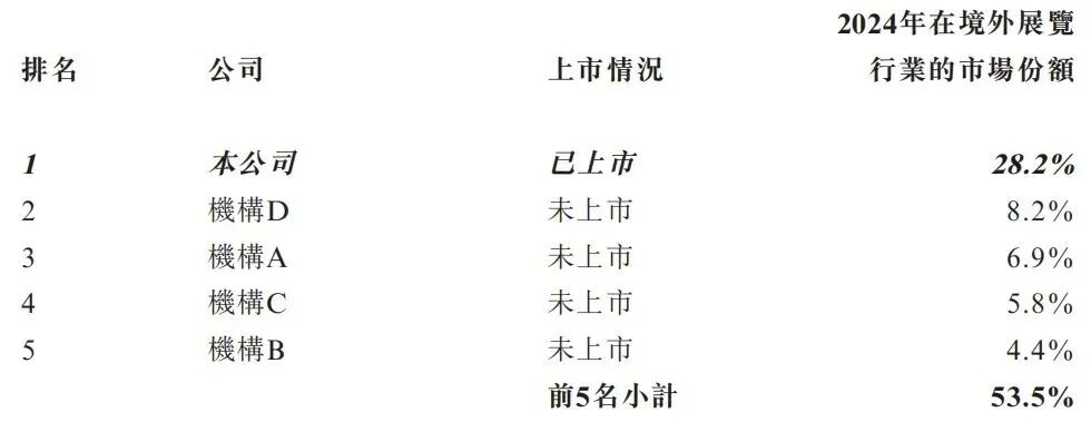 根据弗若斯特沙利文(Frost & Sullivan)报告,按2024年举办的境外自办展览数量及面积计,公司在所有中国的境外展览机构中名列第一。