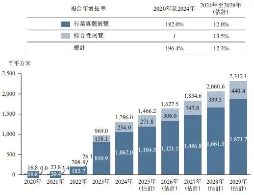 根据弗若斯特沙利文(Frost & Sullivan)报告,预计展览总面积将从2024年的1,296.0千平方米大幅增加至2029年的2,312.1千平方米。