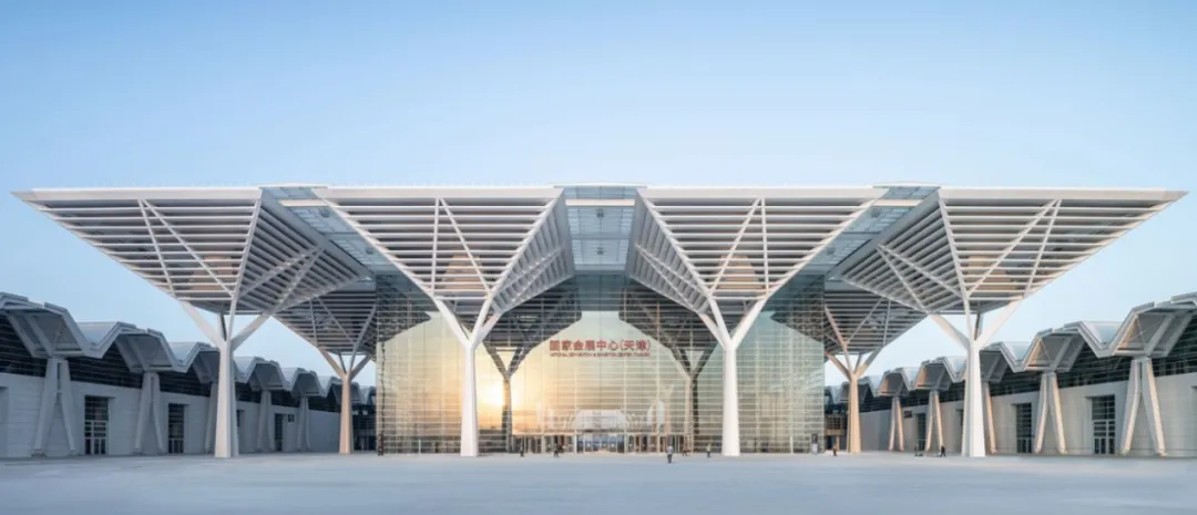 天津国家会展中心项目总建筑面积达138万平方米,融合展览、会议、商业、办公与酒店等多重功能。中建八局二公司装饰公司装饰与环境设计研究院负责项目的结构设计任务。项目分两期推进,其中二期展馆区中央大厅的幕墙桁架钢结构平面总长295米,宽80米,高33.2米,平面投影呈矩形,由多榀平面桁架组成,外弦杆与主体结构采用铰接连接,整体造型简洁而富有张力,展现出结构在宏大空间中的细腻表达。