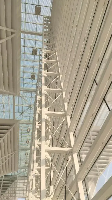 在结构布置方面,项目确立了“精准预焊、无缝对接”的实施路径。所有幕墙龙骨与开启扇的连接件均在工厂精准焊接于桁架杆件上,大幅提升了现场安装效率与完成度。通过采用“空腹式”桁架系统,并辅以预应力拉索作为斜腹杆,不仅有效压缩桁架矢高至1350毫米,更实现了结构的高效受力与视觉减薄。同时,设计团队取消了相邻桁架之间的内弦杆横向支撑,进一步强化了空间的通透感。