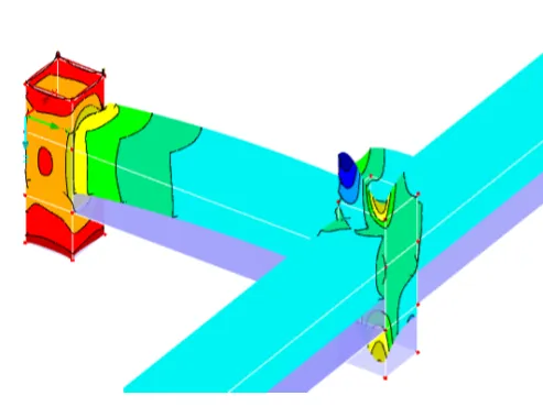 柱脚销轴连接节点受力复杂,传统计算难以精确反映其应力分布。设计团队借助SolidWorks建立精细化有限元模型,对销轴、工字钢之间的接触、荷载传递路径进行仿真模拟,精准计算局部应力集中现象与变形特征,为节点优化与焊接细节设计提供可靠依据,展现“于细微处见真章”的设计匠心。