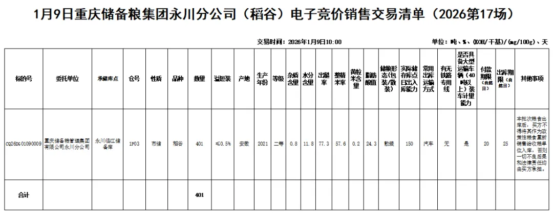 2. 报名时间:2026年1月9日8:00前。报名参与交易即视作全面认可并遵守《重庆市地方政府储备竞价销售交易规则》和交易公告、交易清单等要求。