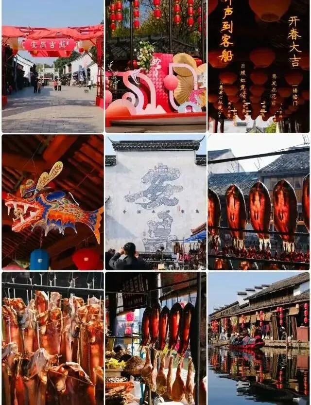 乌篷船咿呀摇过,划开翡翠般的水面。两岸明清建筑倒影如画,连绵廊棚下挂满腊肠、酱鸭,浓郁酱香是古镇独有的烟火诗篇。社戏锣鼓隐约,唤醒水乡静谧的晨昏。