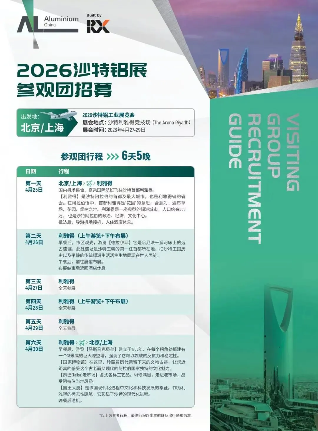基于沙特铝加工新兴市场的发展潜力,ALUMINIUM 全球系列展会今年4月27日至29日首度落地利雅得,深耕当地市场机遇。作为ALUMINIUM全球系列展会之一的中国国际铝工业展览会将组织中国企业参展参观团共赴,助力企业开展国际交流,对接前沿应用技术,精准洞察行业新兴趋势。