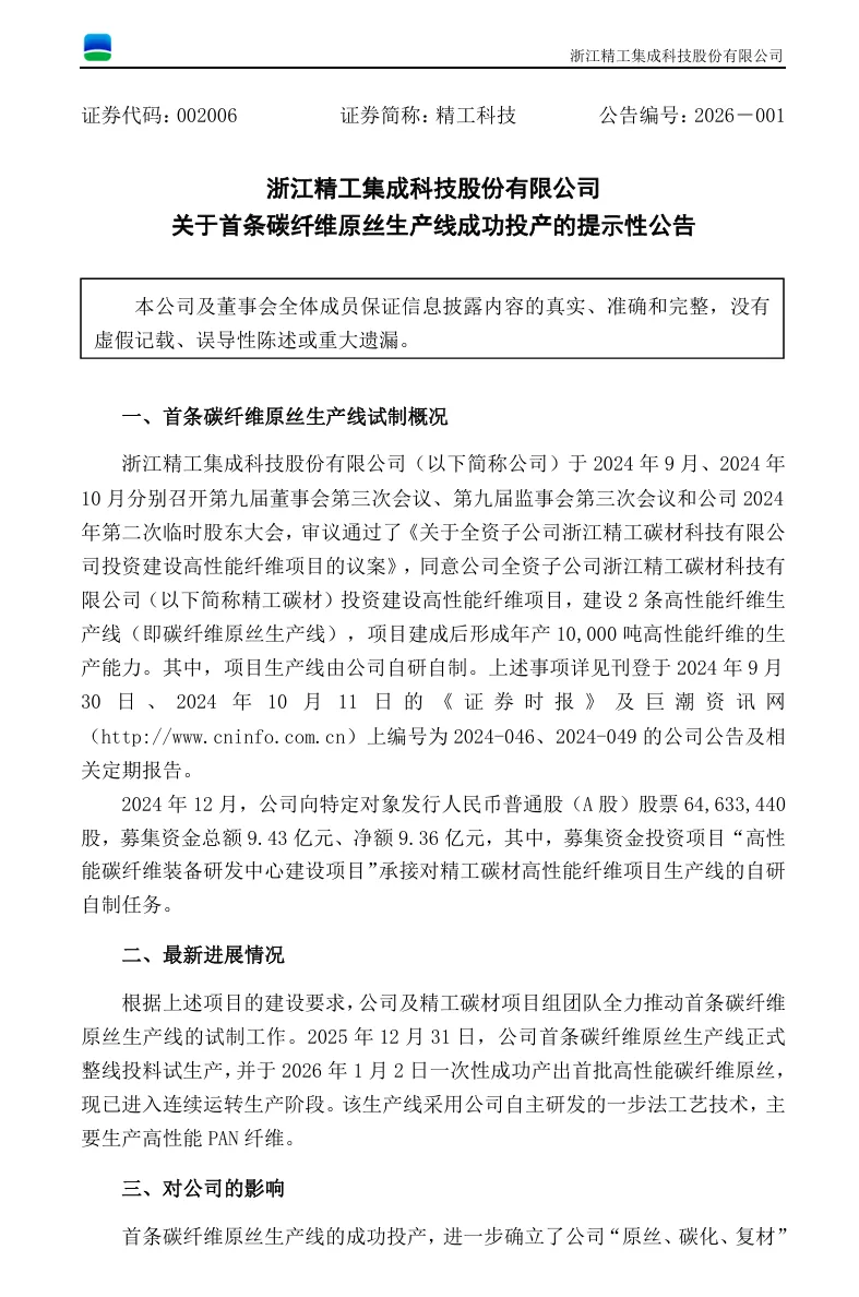 2026年1月4日,精工科技正式公告,其首条碳纤维原丝生产线已于2025年12月31日正式投料试生产,并于新年伊始成功产出首批高性能碳纤维原丝。