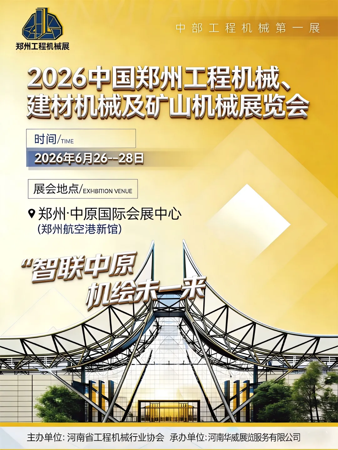 展会时间:2026年6月26日-6月28日 展会地点:中国·郑州中原国际会展中心 指导单位:中国机械工业协会 主办单位:河南省工程机械行业协会 河南砂石协会 承办单位:河南华威展览服务有限公司
