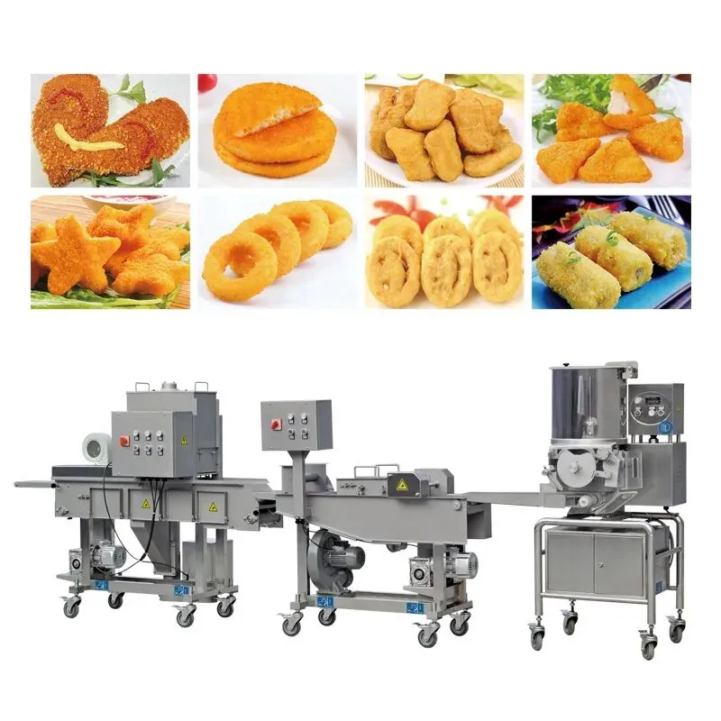 可以自动完成成型、上浆、上粉、上面包屑、油炸等工序。生产线自动化程度高,操作简单,清洗方便。适用的原料:肉类(禽类、牛肉、羊肉、猪肉),水产(鱼、虾等),蔬菜(马铃薯、南瓜、青豆等),奶酪以及它们的混合料。