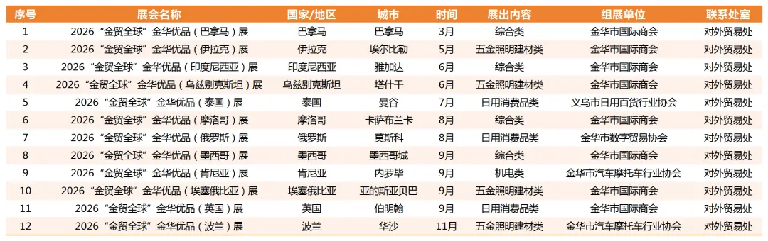 为加快建设高能级开放强市,进一步发挥展会拓市场、增订单的积极作用,金华市商务局发布了2026年度金华市商务展会目录,拟重点组织和支持展会项目153个(包括自办展会和重点展会)。