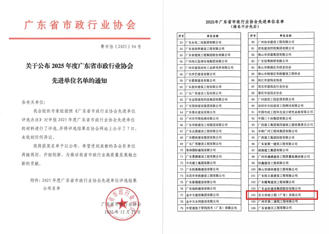 近日,广东省市政行业协会公布了2025年度广东省市政行业协会先进单位名单。翠亨新区企业长大市政工程(广东)有限公司(以下简称“长大市政公司”)凭借扎实经营、规范管理和突出的社会价值贡献获得该称号。长大市政公司成为中山市唯一一家获此殊荣的施工类企业。