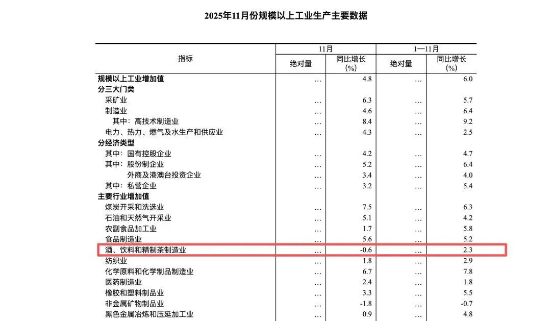 数据显示,11月,酒、饮料和精制茶制造业工业增加值同比下降0.6%,1-11月累计同比增长2.3%。其中,规模以上工业白酒11月份的产量为31.8万千升,同比下降13.8%;1-11月累计产量为321.5万千升,同比下降11.3%。