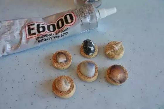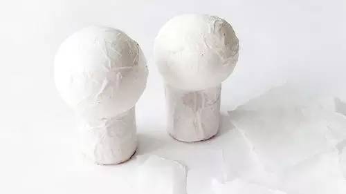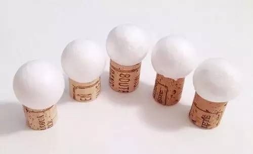 ▼在红酒塞与泡沫塑料球的表面涂满胶水,粘上一层白色薄纸或厨房卷纸,等它完全干透。